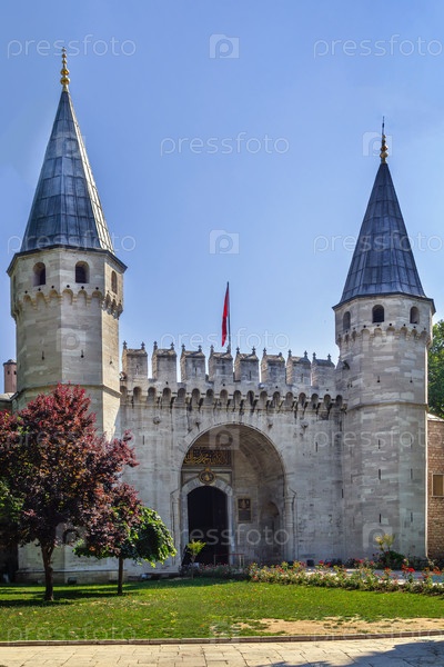 Ворота приветствия во Второй двор Дворца Топкапи в Стамбуле, Турция.Османская архитектура замка под голубым небом