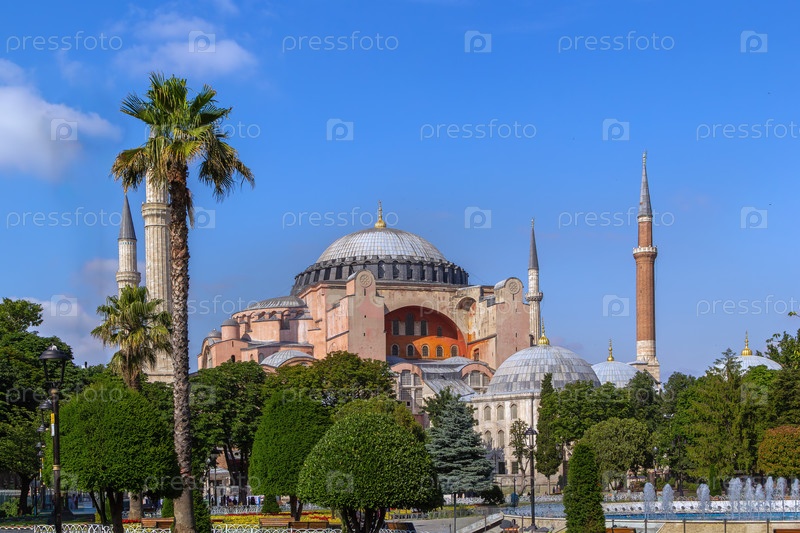 Вид на мечеть Святой Софии со площади Султанахмета в Стамбуле, Турция.Византийская архитектура с куполами под солнечным голубым небом