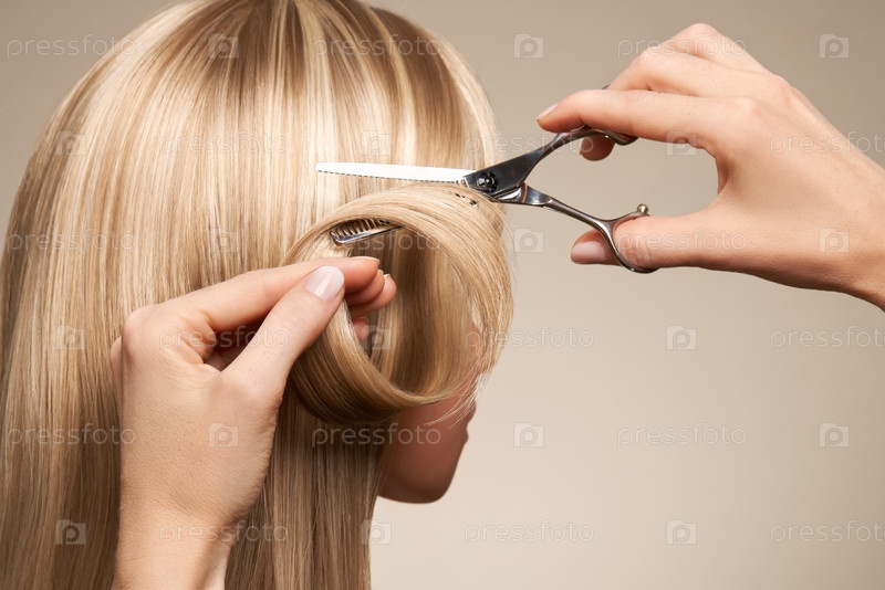 Парикмахер режет длинные волосы блондинки ножницами
