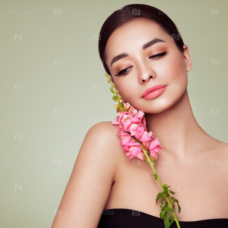 Красивая молодая женщина с розовым цветком дельфиниума