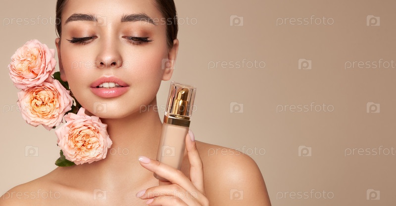 Красивая молодая женщина с бутылкой фондеров и розовыми цветами