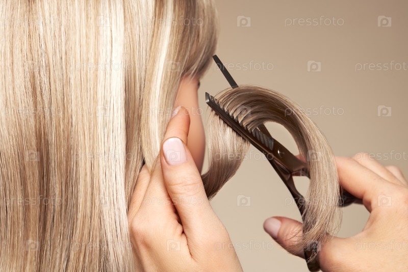 Парикмахерская режет длинные блондинки ножницами