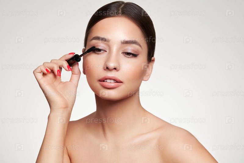 Женщина красоты наносит черную тушь на ресницы