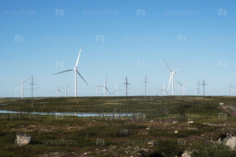 Ветряные турбины и линии электропередач в Мурманской области, Россия.Ветровая ферма Кола.Северный ландшафт тундры