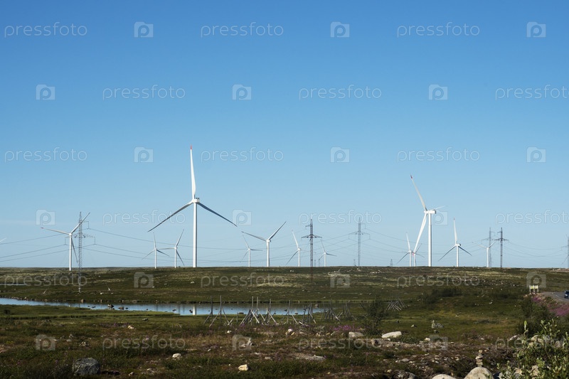 Ветряные турбины и линии электропередач в Мурманской области, Россия.Ветровая ферма Кола.Северный ландшафт тундры