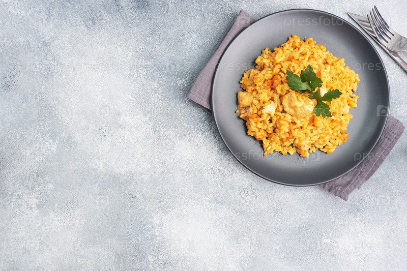 Вкусный азиатский пилаф, запеченный рис с овощами и курицей на тарелке. серый бетонный фон. копировальное пространство