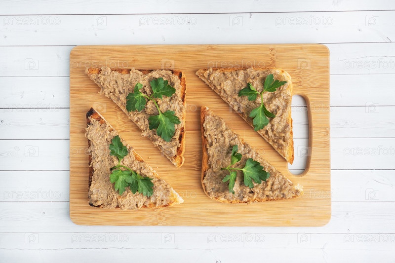 Сэндвичи с хрустящим тостом и куриной печеночной пастой с листьями петрушки на деревянной доске для резки