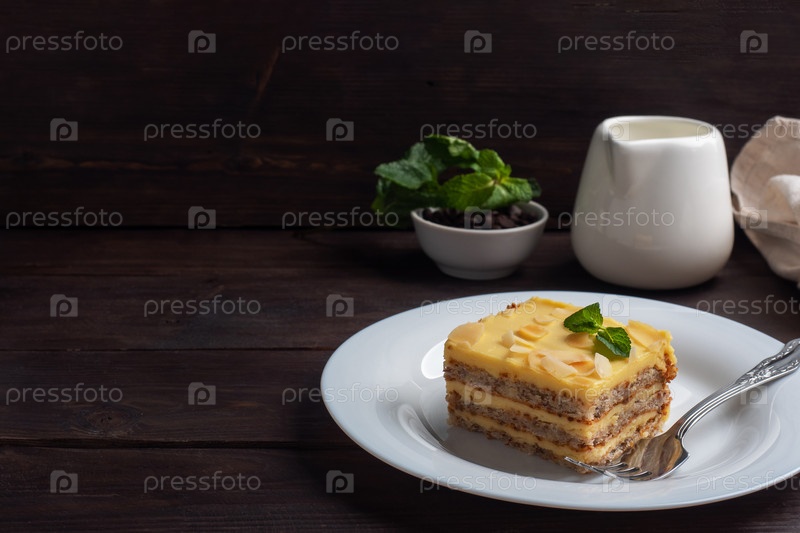 Банановый губчатый торт с орехами и мятой, вкусный сладкий десерт для чая на темном деревянном фоне