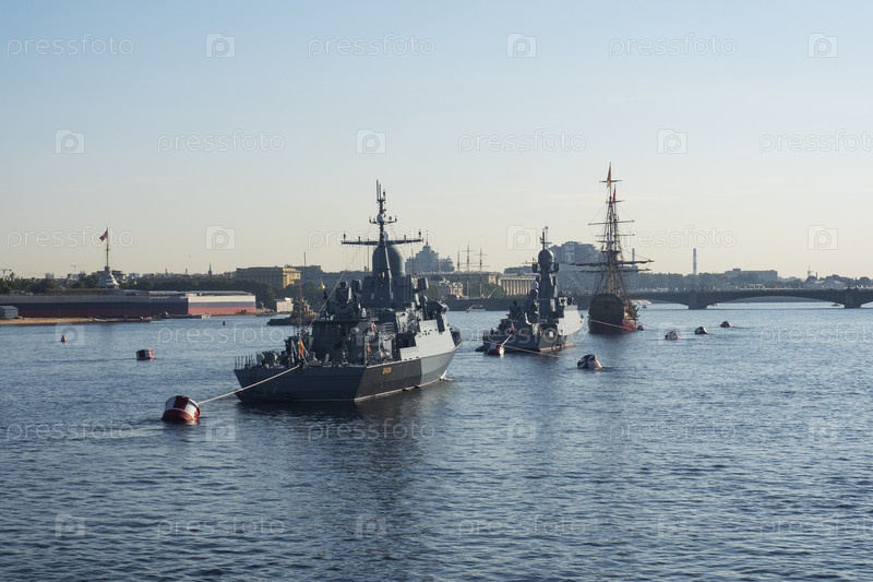 Санкт-Петербург, Россия, 24 июля 2024 года: Военные корабли на реке Неве Парад - это празднование Дня ВМС