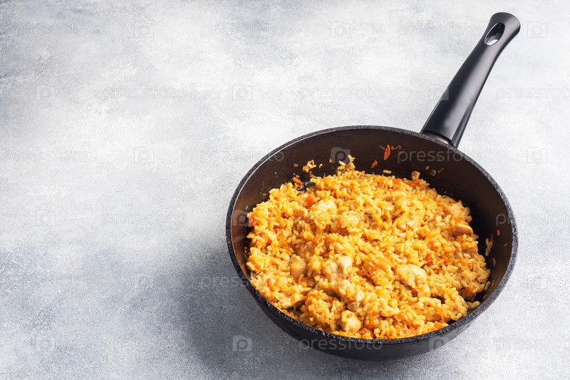 Вкусный азиатский пилаф, запеченный рис с овощами и курицей в сковороде. серый бетонный фон. пространство для копирования