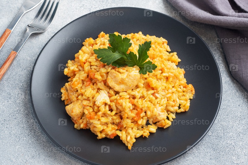 Вкусный азиатский пилаф, запеченный рис с овощами и курицей на тарелке. серый бетонный фон