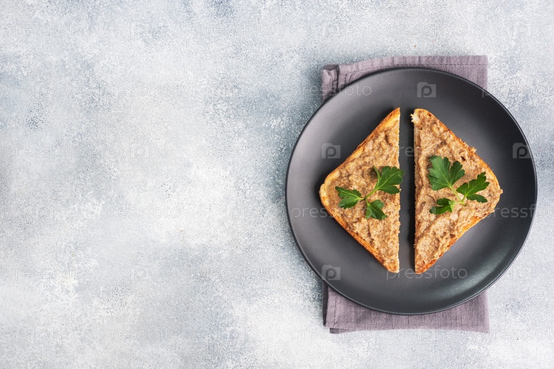 Сэндвичи с хрустящим тостом и куриной печеночной пастой с листьями петрушки на черной тарелке. на сером бетонном столе. Копировать пространство
