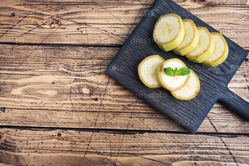 Банан и нарезанный банан на кусочки с мятой на деревянном рустическом фоне. верхний вид, копирование пространства