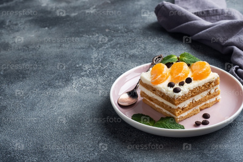 Слои губчатого торта с масляным сливком, украшенные кусочками мандаринного шоколада и мяты. вкусный сладкий десерт для чая. вид сверху, пространство копирования