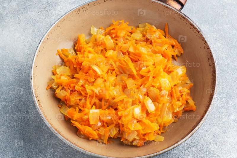 Жарьте в кастрюле обжаренные морковь и нарезанный лук с маслом. серый бетонный фон