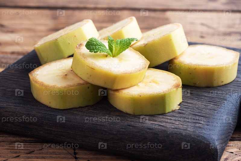 Банан и нарезанный банан на кусочки с мятой на деревянном рустическом фоне
