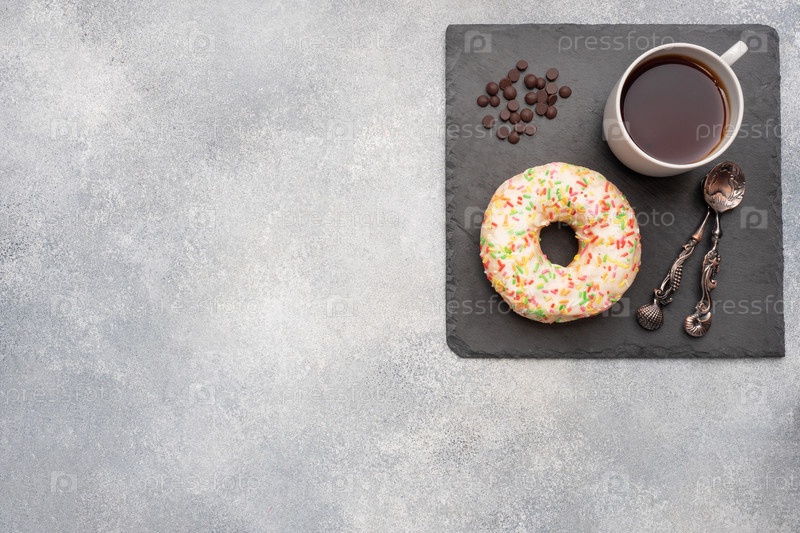 Пончик в глазуре и чашка кофе на столе. серый бетонный стол, пространство для копирования