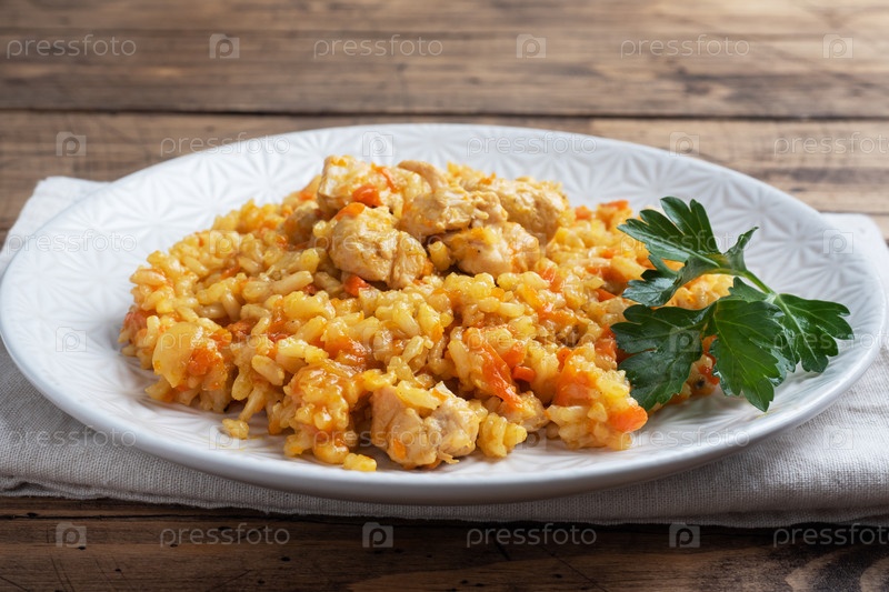 Вкусный азиатский пилаф, запеченный рис с овощами и курицей на тарелке