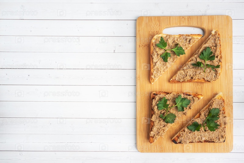 Сэндвичи с хрустящим тостом и куриной печеночной пастой с листьями петрушки на деревянной доске для резки