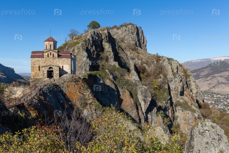 Вид на церковь Шоани, каменный средневековый аланский христианский православный храм