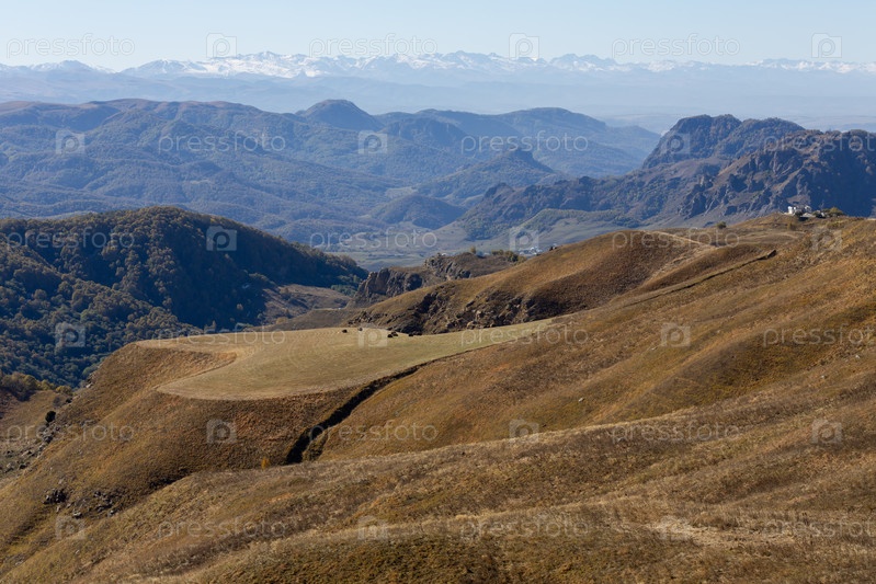 Панорамный вид на вершины Главного Кавказского хребта и предгорья с выцветшими травянистыми склонами от перевала Гумбаси в ясный осенний день