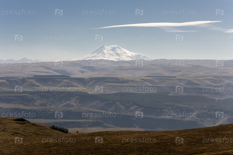 Пейзаж горы Эльбрус и предгорья в солнечный осенний день