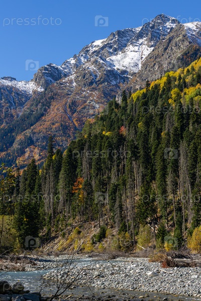 Пейзаж скалистого, крутого горного ущелья, покрытого осенним лесом