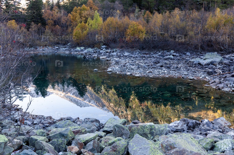 Отражение гор в воде озера Бадук в ущелье на Домбае