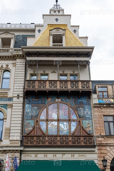 Батуми, ГРУЗИЯ - 27 ОКТОБРА 2023 года: Фасад с красочными витражами здания бывшего Национального банка Грузии на площади Европы в Батуми