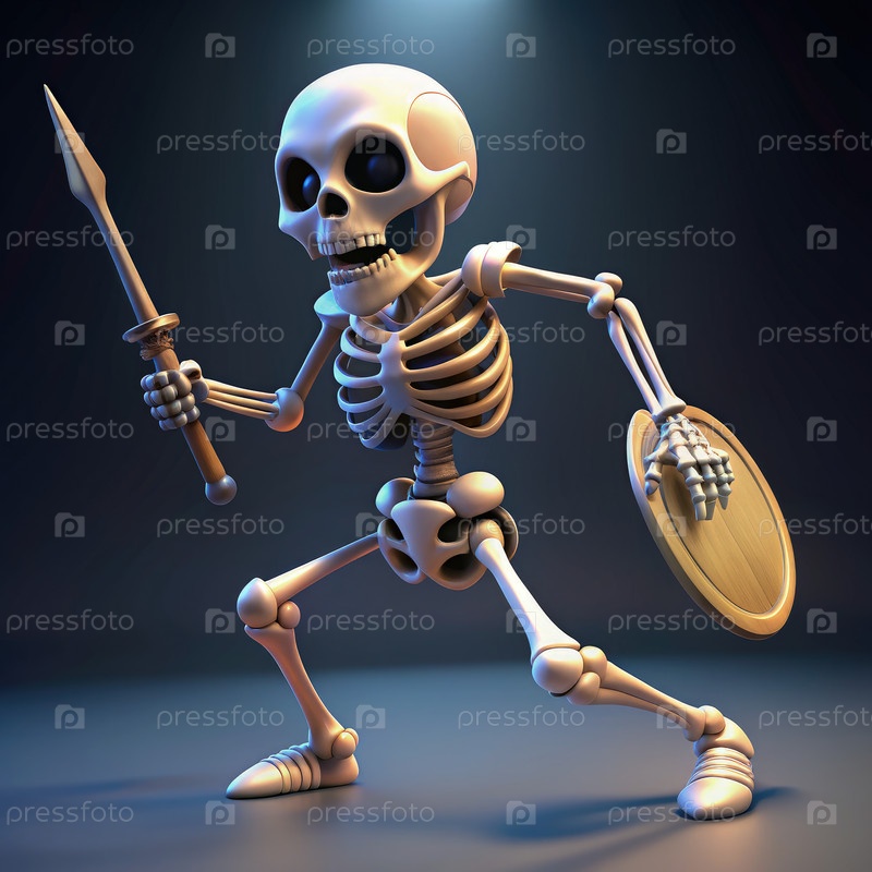 Стилизованный мультфильм Скелетные воины в динамической позе с копьем и щитом. генеративная ИИ