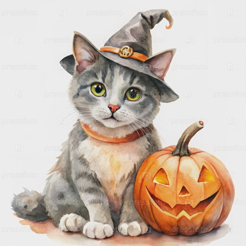 Акварельная живопись кота Хэллоуина в колдовской шляпе