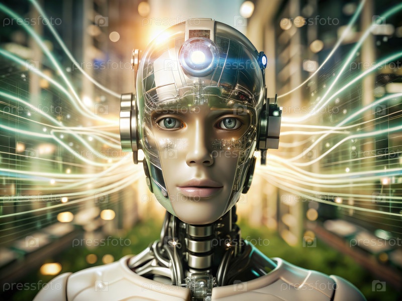 Роботизированная голова, демонстрирующая эмоции в футуристической городской среде на рассвете