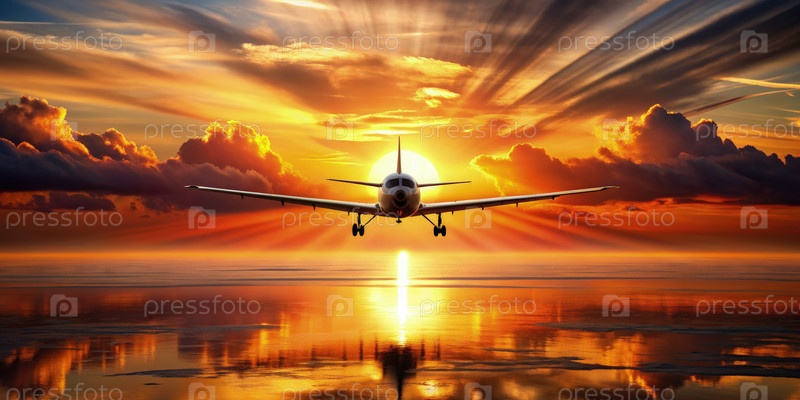Самолет, летящий к закату солнца над морем. генеративный ИИ