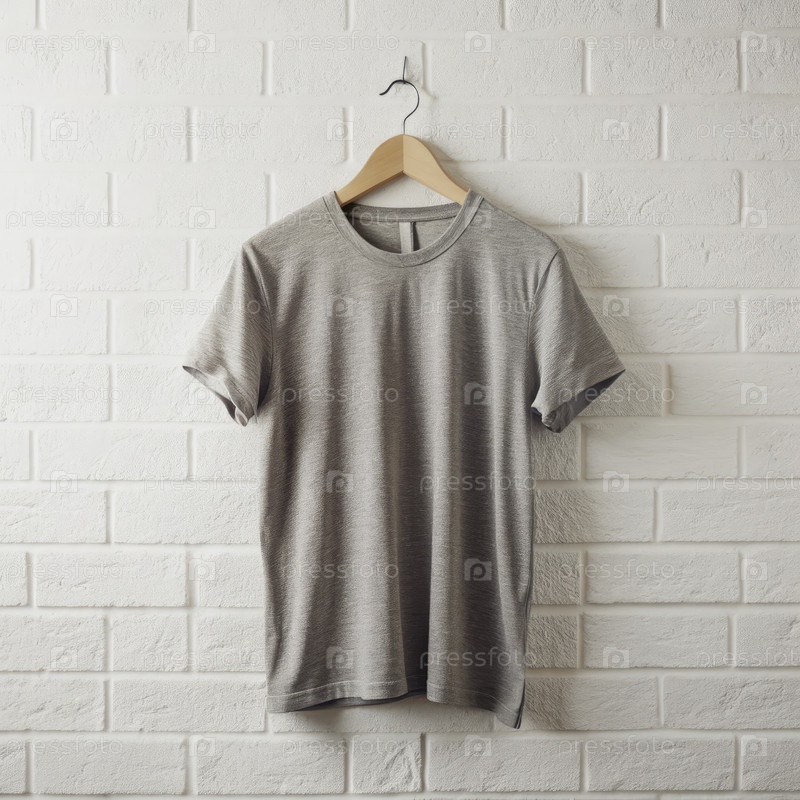 Серая футболка, висящая на деревянном вешальнике против белой кирпичной стены