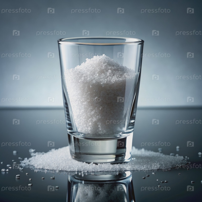 Стекло, заполненное белой кристаллической солью на отражающей поверхности