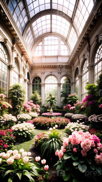 Теплица в викторианском стиле, наполненная цветущими цветами