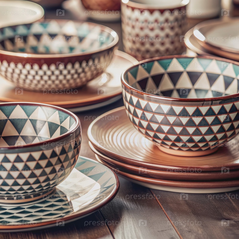 Геометрическая керамическая посуда с треугольными узорами на деревянном столе