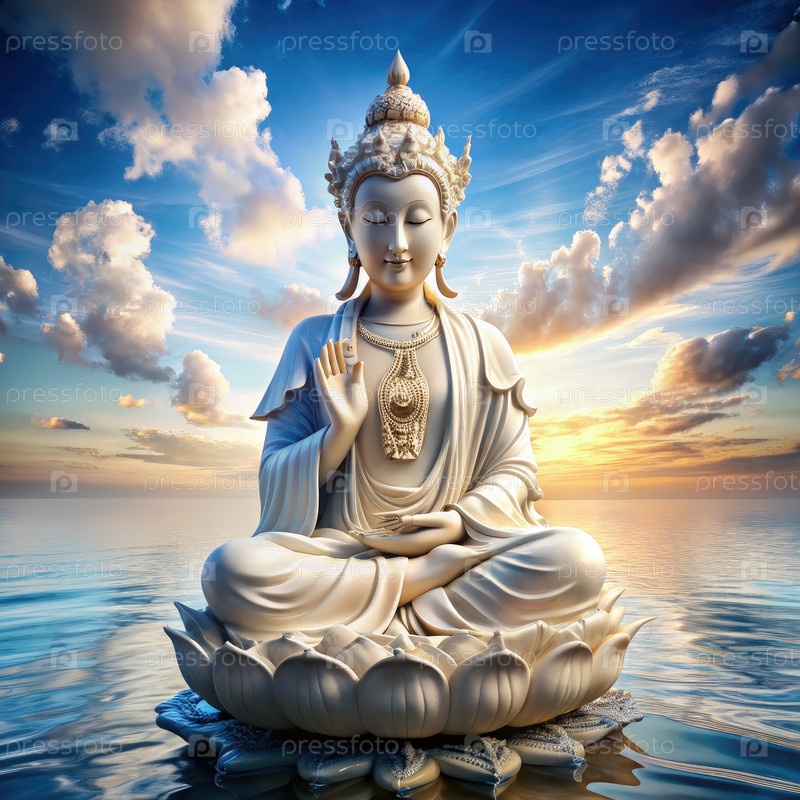Статуя Серена Гуанин медитирует над цветом лотоса среди тихого морского пейзажа при закате солнца