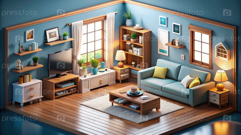Уютная гостиная с голубыми стенами и деревянной мебелью