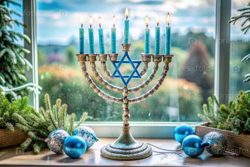 Праздничная выставка искусств и ремесел Хануки с менорой и декоративными орнаментами возле яркого окна