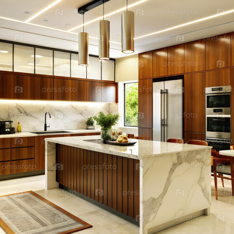 Кухня с элегантными деревянными шкафами и мраморными столешницами в ярком, открытом пространстве с естественным светом