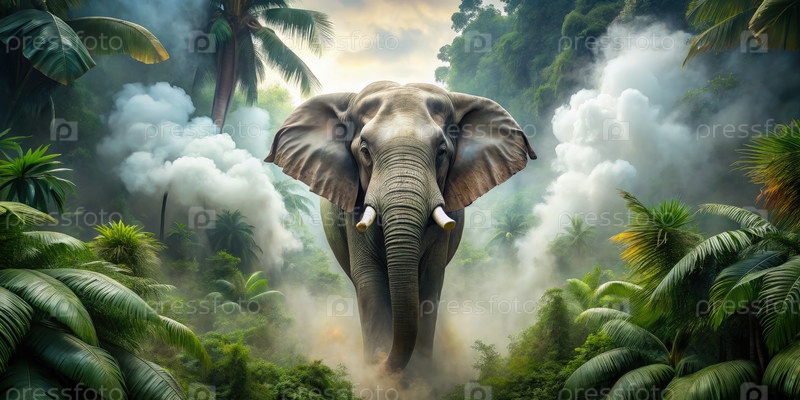 Дух слона выходит из тумана в пышном джунглях