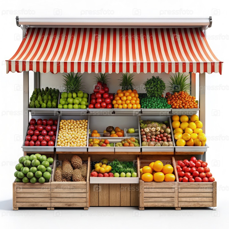 Подставка для свежих фруктов с красным и белым полосатым тентом. генеративный AI