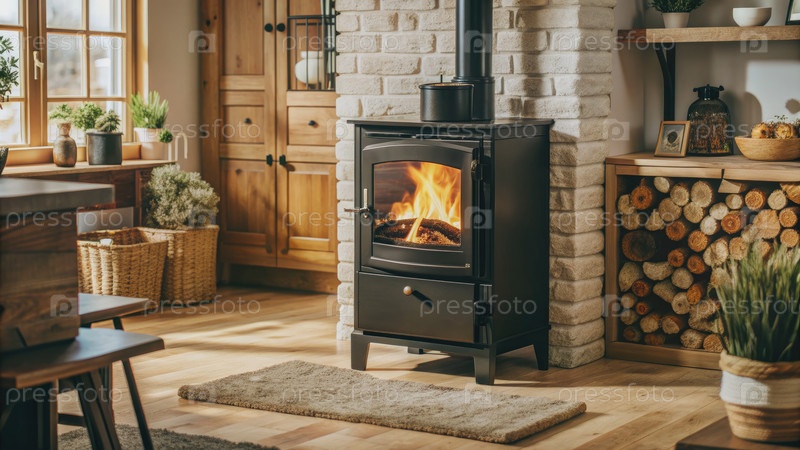 Черный камин с печью в уютном интерьере деревенского дома. генеративная современная AI