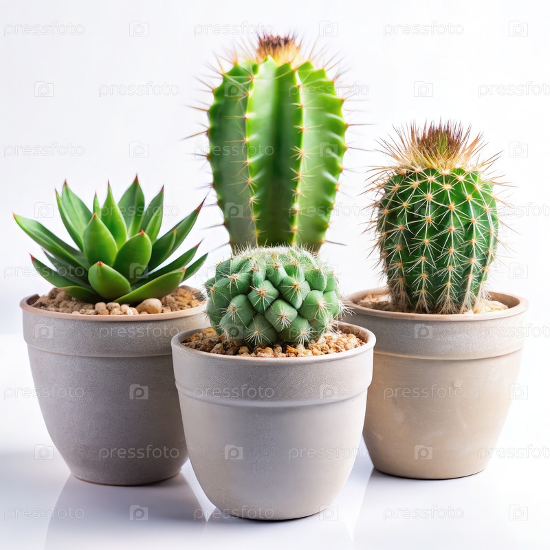 Живые зеленые соккуленты и кактусы в элегантных керамических горшках на чистом белом фоне