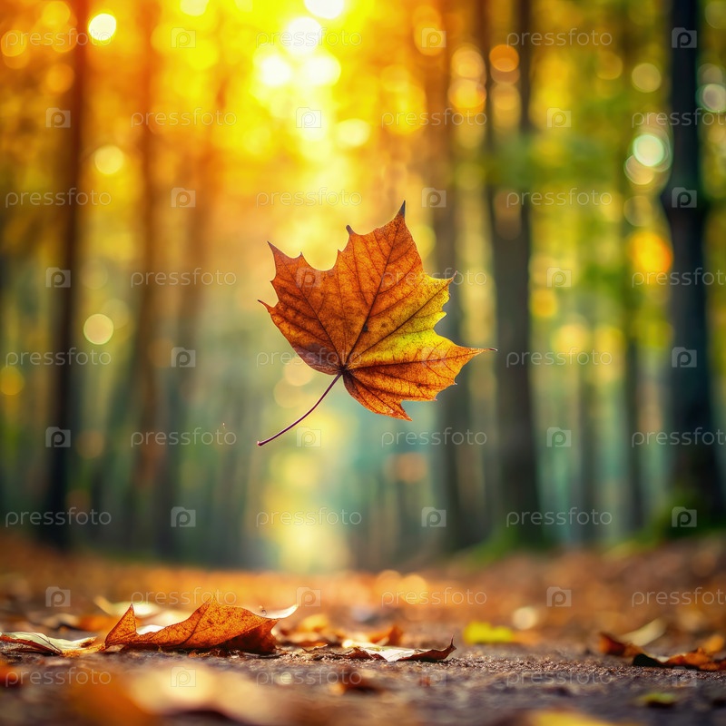 Осенний лист падает на лесную тропу с солнечными лучами
