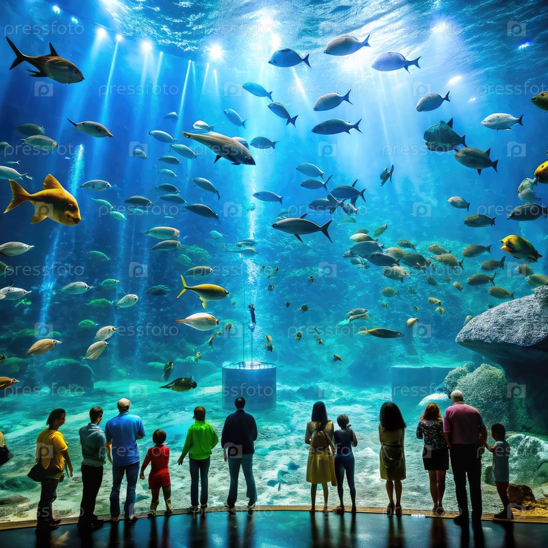 Посетители удивляются разнообразной морской жизни в большом аквариумном баке