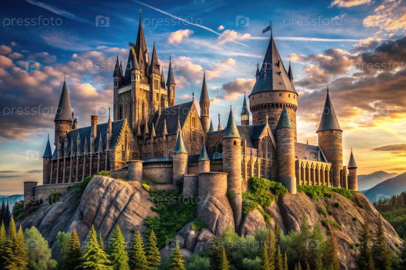 Величественный каменный замок, расположенный на вершине холма при закате солнца