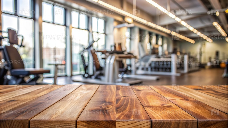 Пустое деревянное столовое пространство с видом на современную среду тренажерного зала в дневное время
