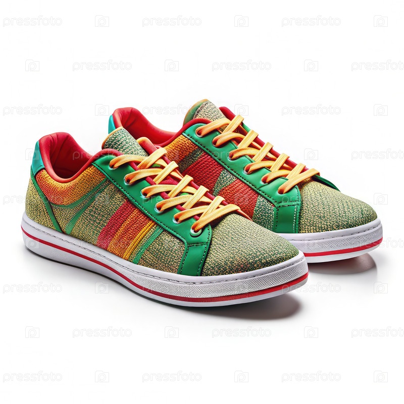 Ярко окрашенные кроссовки изолированы на чистом белом фоне для демонстрации моды и рекламного использования